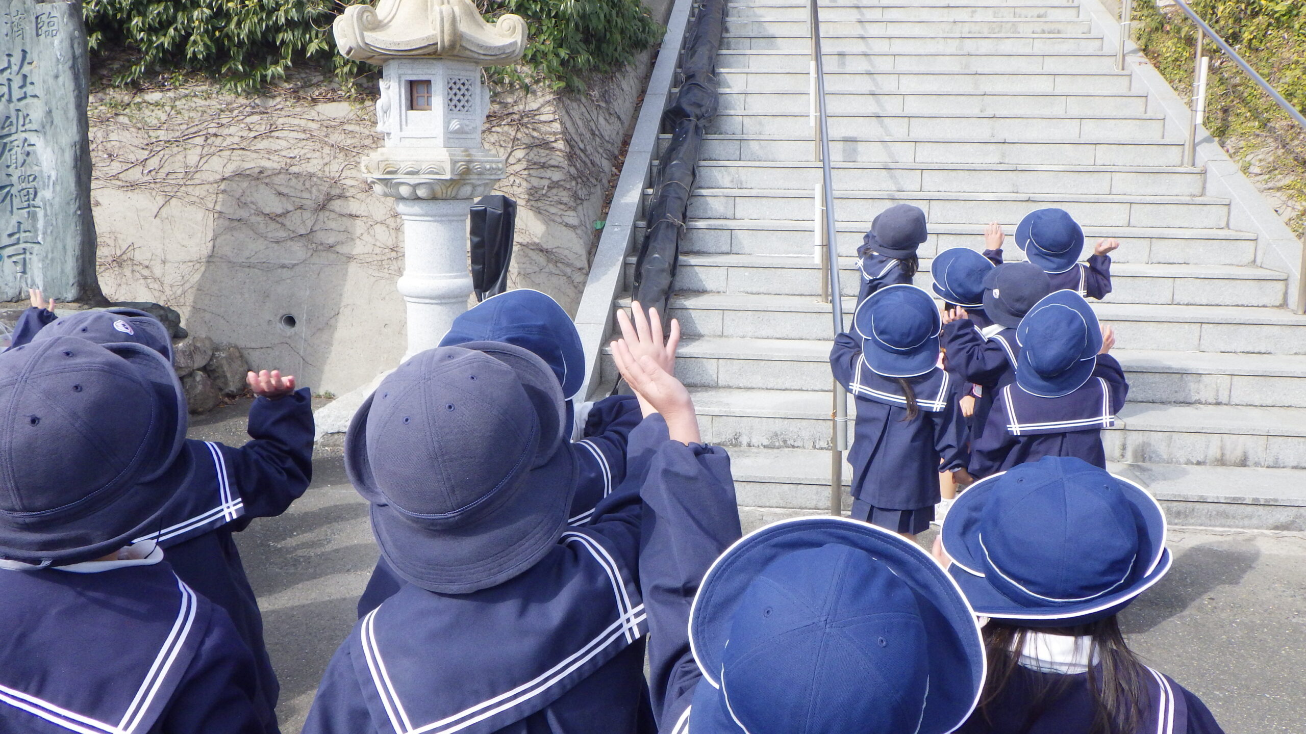 年長さん、年中さんは志賀島保育園に園児たちと一緒に荘嚴寺まで歩いて行きました(星組はバスで…)。